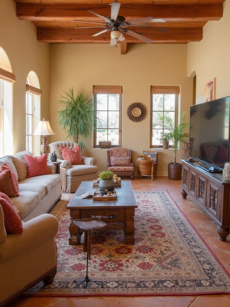 Southwestern design brings desert-inspired warmth, terracotta tones, and regional character into your living room. This style creates a welcoming social hub that perfectly balances aesthetics with functionality.