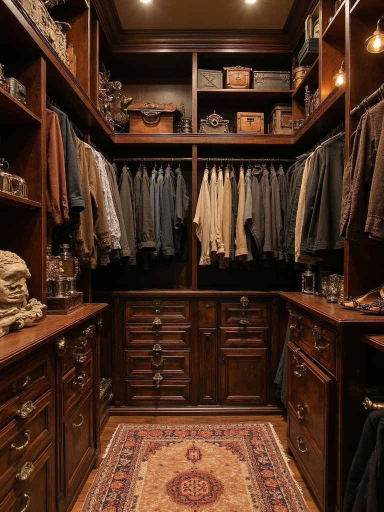 Steampunk design brings Victorian-industrial fusion, mechanical artistry, and retro-futuristic charm into your closet. This style creates a beautifully designed space that perfectly balances aesthetics with functionality.